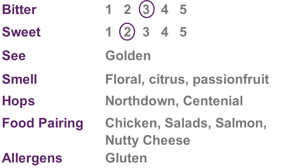 A light, hoppy golden ale delicately balanced with a subtly honey-citrus finish. Dry hopped with Australian hops to give a floral, passionfruit & citrus aroma.
