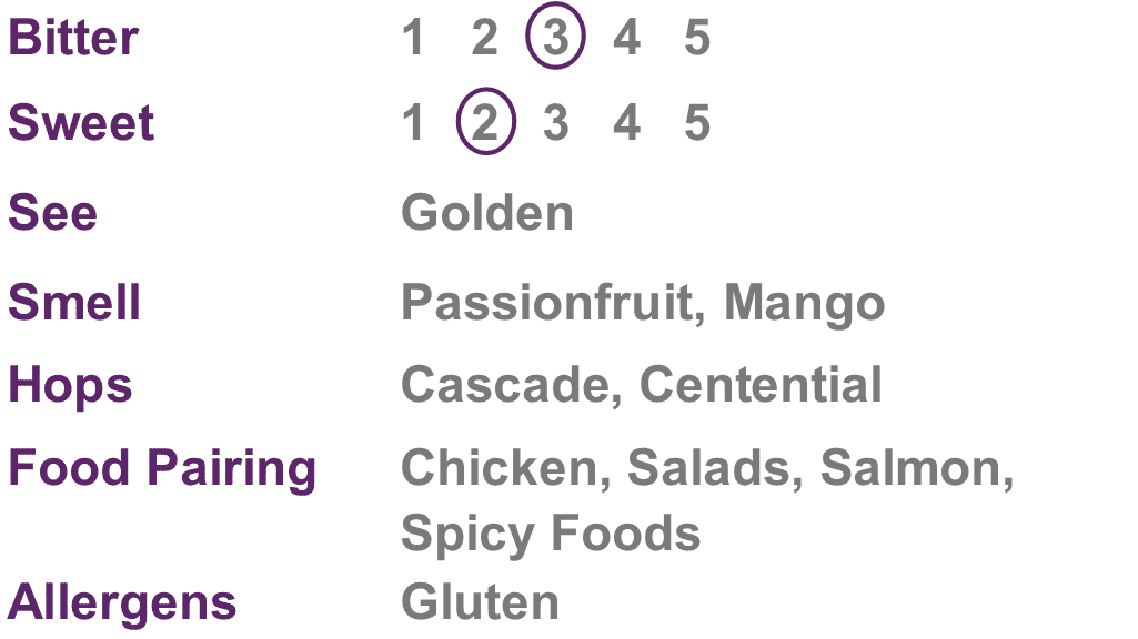 An exquisite taste combination of tropical fruits and refreshing golden ale leading to a passionfruit & mango aroma.